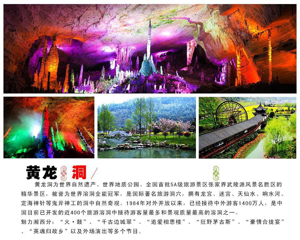 前往“空中圣湖”[寶峰湖景區(qū)](門票96元,可代訂優(yōu)惠門票):蕩舟——“人間瑤池”聽土家阿哥阿妹山歌傳情、兩岸碧水悠悠、鷺鷥捕魚,寶峰湖集山水于一體,融民俗風情于一身,尤以奇秀的高峽平湖絕景、“飛流直下三千尺”的寶峰飛瀑、神秘的深山古寺聞名,觀賞寶峰飛瀑、仙女照鏡、石門迎賓、孔雀開屏、金蟾含月、神龜出水等栩栩如生的景點[或游覽地下國寶—黃龍洞景區(qū)(門票100元,可代訂優(yōu)惠門票):黃龍洞享有“世界溶洞全能冠軍”之美譽,2005年被評選為“中國最美的旅游溶洞”,洞中燈火闌珊、石筍林立,猶如一株株古木錯節(jié)盤根、洞中有洞、洞中有河、無奇不有,真乃名副其實的“地下魔宮”,洞中還有投保一億元的石筍定海神針、響水河、龍王聚會廳、天仙水、天柱街等著名景點。(以上寶峰湖及黃龍洞可根據客人游覽興趣二選一)],游玩后可入住市區(qū)酒店。